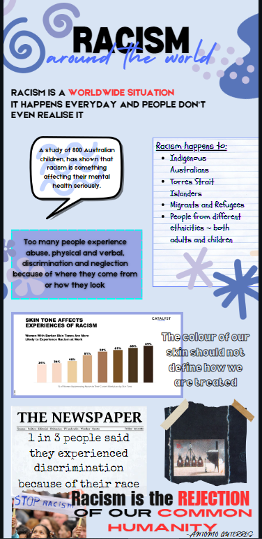 For my piece of transmedia, I decided to use quotes, facts, and graphs, to create an infographic. This infographic shows the many people that daily racism happens to, how it happens worldwide, what people are going through, and it shares a message to everyone spreading awareness. I think showing simple facts and statistics can show a bold statement and can prove a big point. Showing that there is evidence and lots of it can make someone go 'oh, maybe this is right' or 'oh, there is proof of this happening, I didn’t even realise'. The evidence in this case is showing that this is a very real thing happening in the world and it’s happening a lot.