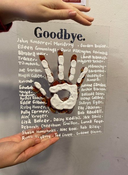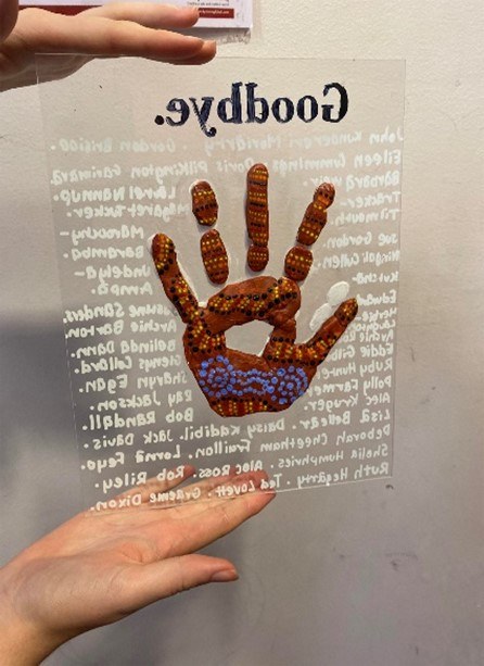 I used glass which represents fragility, much like the bonds of these families. Next, I used two hands on opposite sides of the glass to display what the last ‘goodbye’ would look like for an elder and child who is being taken away and included names on the glass of the children who were taken by the government.