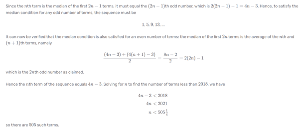 'An infinite increasing list of numbers has the property that the median of the first n terms equals the nth odd positive integer. How many numbers in the list are less than 2018?'